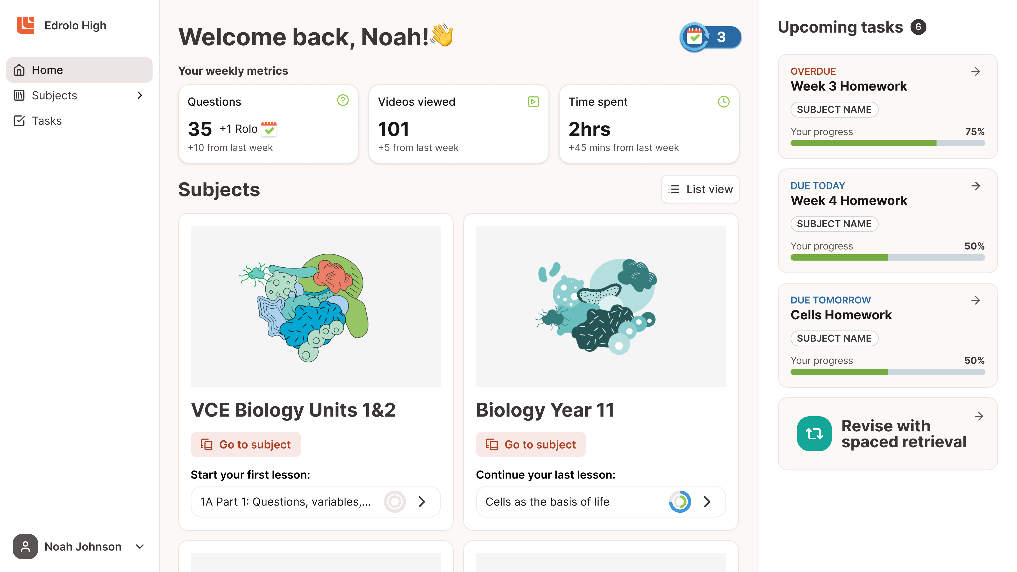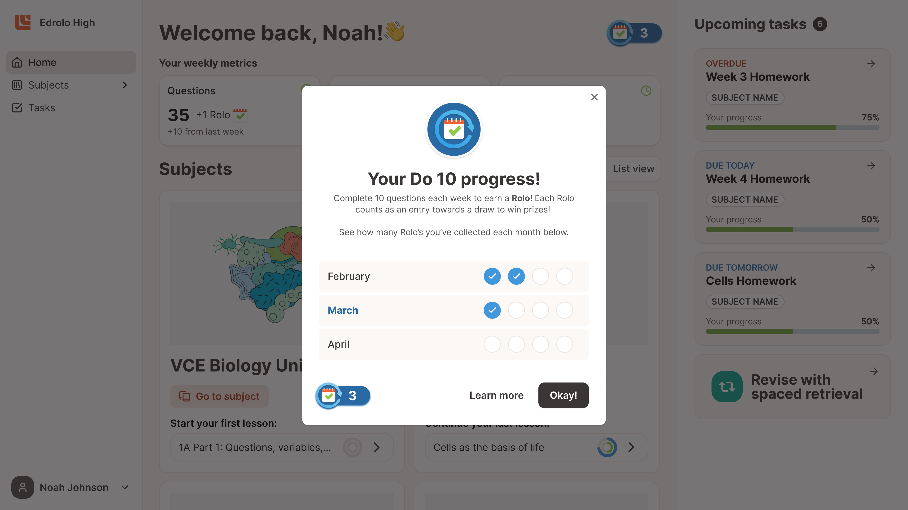 Students can see their Rolos in the top right-hand corner of their Edrolo homepage, making their consistency immediately visible.